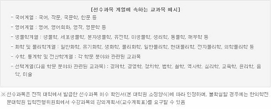 • 선수과목(4년제 대학 및 대학원에서 취득)으로 아래에서 지정한 계열 중 4계열 이상에서 총 24학점을 취득한 자(4년제 대학 시간제등록 학점 및 4년제 사이버대학에서 취득한 학점도 인정)